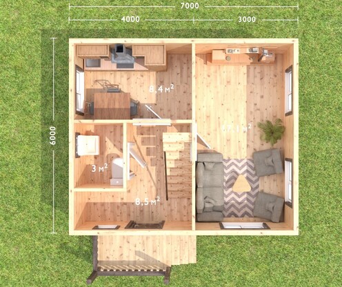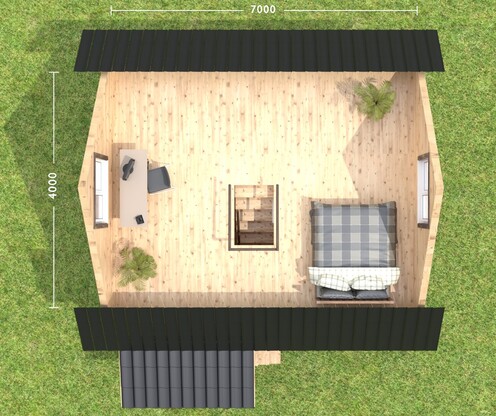 Планировкой предусмотрены холл, санузел, просторная гостиная и большая спальня на мансардном этаже. Приятным дополнением для Вас будут балкон и небольшая веранда. По желанию Заказчика планировку можно менять.